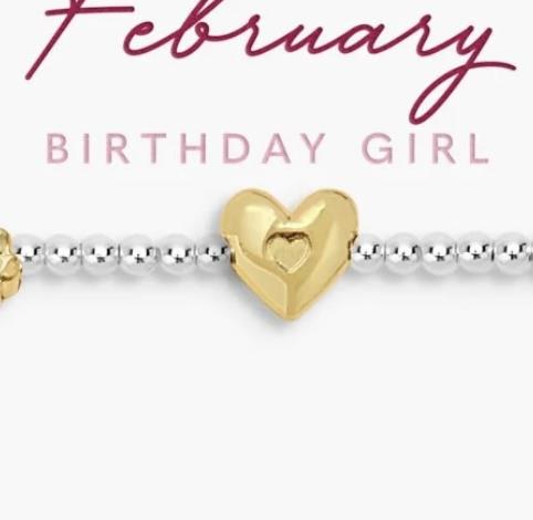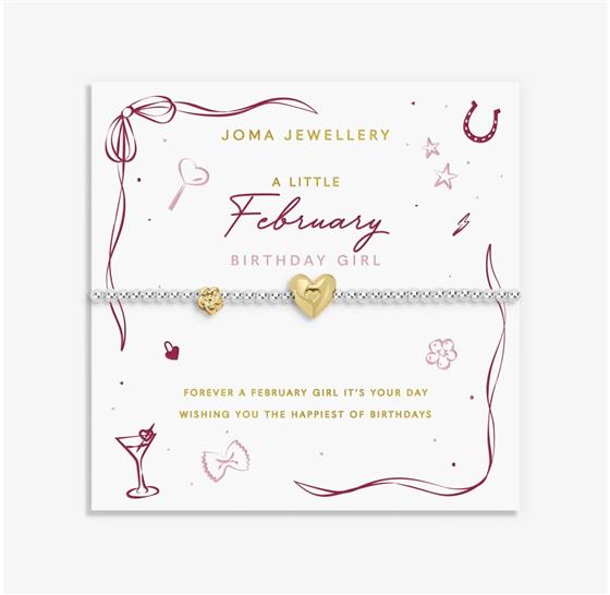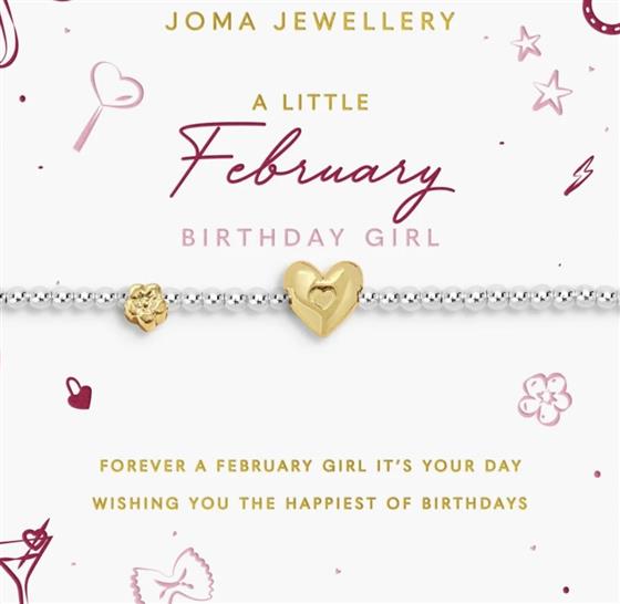 Joma Jewellery A charming new addition ready to see every birthday girl shine, say hello to the Birth Month A Little Collection. The Birth Month A Little 'February' Bracelet in Silver and Gold Plating features a beautiful beaded design, crowned with a shining heart, and paired with a little flower charm to represent the February girl. It's sure to delight on a sentiment-stamped card, illustrated with the sweetest hand-drawn icons to match her vibe.