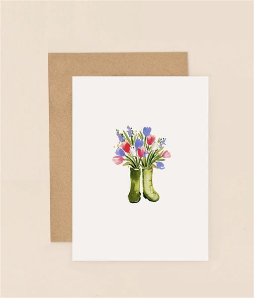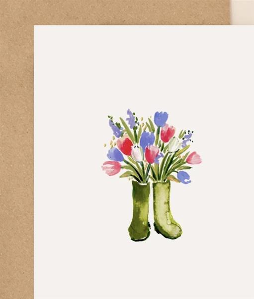 Send a little joy with this charming mini card, perfect for any occasion, celebration, birthday, party invite, or as a simple pick-me-up. Featuring a delightful illustration of a pair of wellies filled with a bouquet of beautiful wild spring flowers, this card brings nature’s vibrant colours and fresh beauty to any special moment.