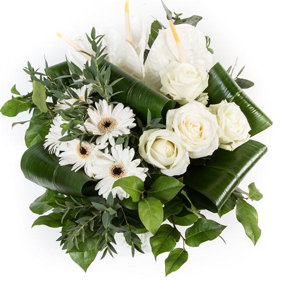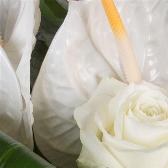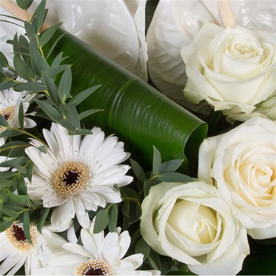 This sectioned hand-tied bouquet comes presented in a aqua box with white anthuriums, gerberas and roses to create a stunning display. Available with a hand-tied vase as pictured at extra cost.