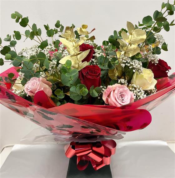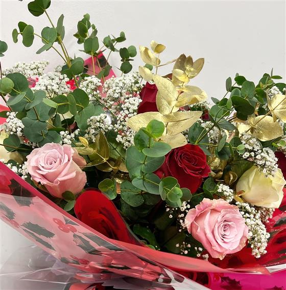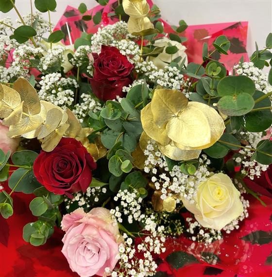 A dozen best long stemmed Red, White and Pink Roses, Gypsophila, Normal and Gold Eucalyptus.