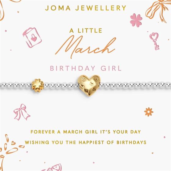 A charming new addition ready to see every birthday girl shine, say hello to the Birth Month A Little Collection. The Birth Month A Little 'March' Bracelet in Silver and Gold Plating features a beautiful beaded design, crowned with a shining heart, and paired with a little clover charm to represent the March girl. It's sure to delight on a sentiment-stamped card, illustrated with the sweetest hand-drawn icons to match her vibe.