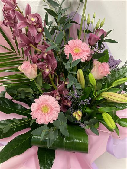 This front facing arrangement includes Cymbidium Orchid, Roses, Germinis, a lily and other complimentary flowers plus eucalyptus & a festive pick to finish.💕