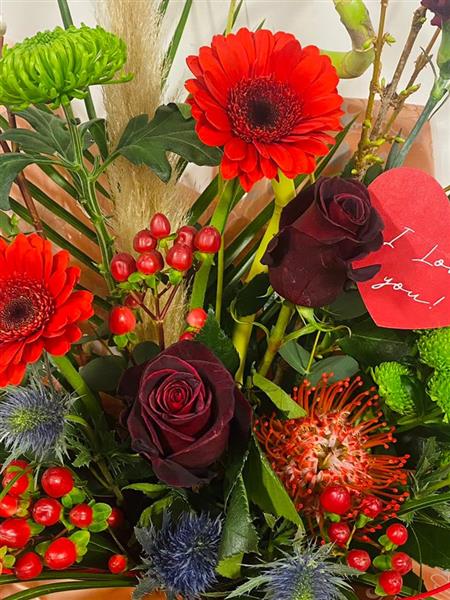 A smaller sized front facing arrangement in oasis with traditional style flowers including a rose, berries and other mixed flowers. heart pick included.