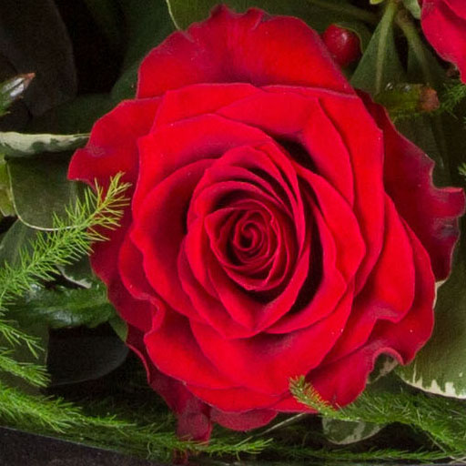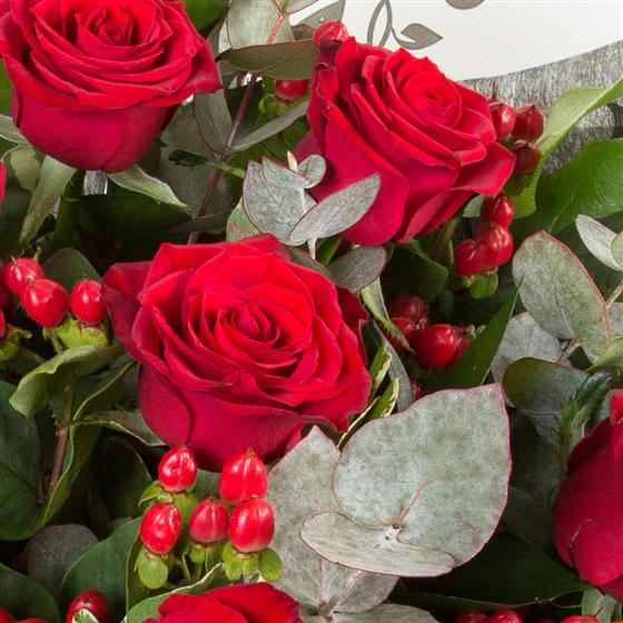 A hand-tied bouquet in a aqua bag of six sumptuous roses encased in a selection of greenery and berries or gypsophilia.
