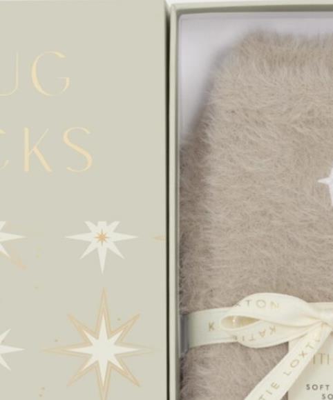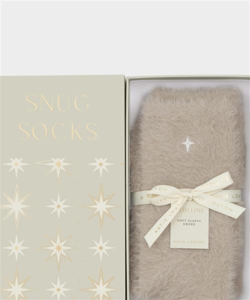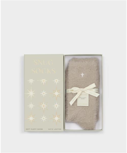 Our Gift Boxed Fluffy Socks in Taupe features a super-soft pair of socks with an embroidered star detail, perfect for keeping feet cosy. All wrapped up in a beautiful gift box with the sentiment 'Snug Socks,' ready to surprise and delight the lucky recipient.